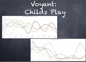 At this point my presentation shifted towards the research I had completed. I began with Voyant. Voyant is a great tool for creating pretty pictures and finding word frequency at certain places in a work, but as I explained, it is just not powerful enough to produce any kind of significant data, especially given the size of my corpus.