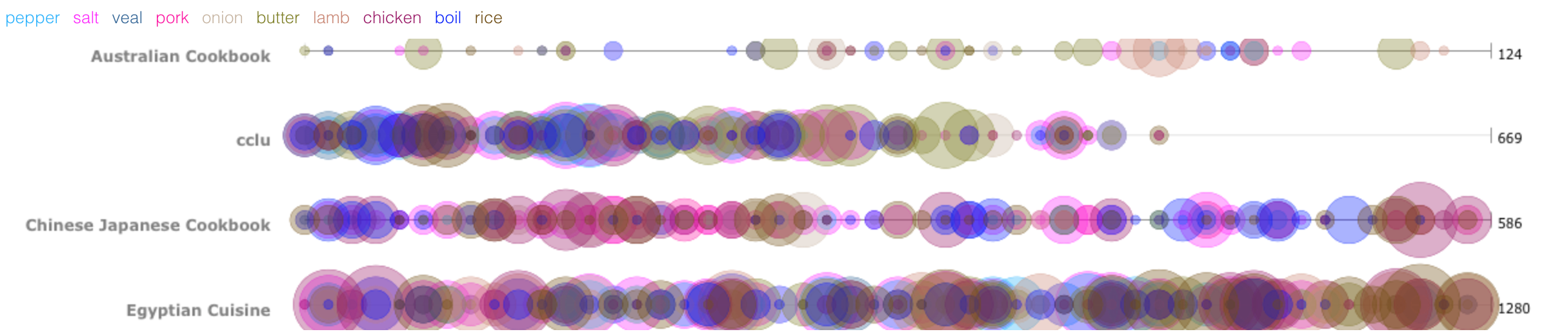 This is the bubblines graph generated by Voyant. I searched for “pork”, “chicken”, “butter”, “pepper”, “fish”, and “curry” in this corpus in order to see how often these ingredients are used in different cultures’ cookbooks. It is surprising to see that people from Australia and India do not eat pork very often.