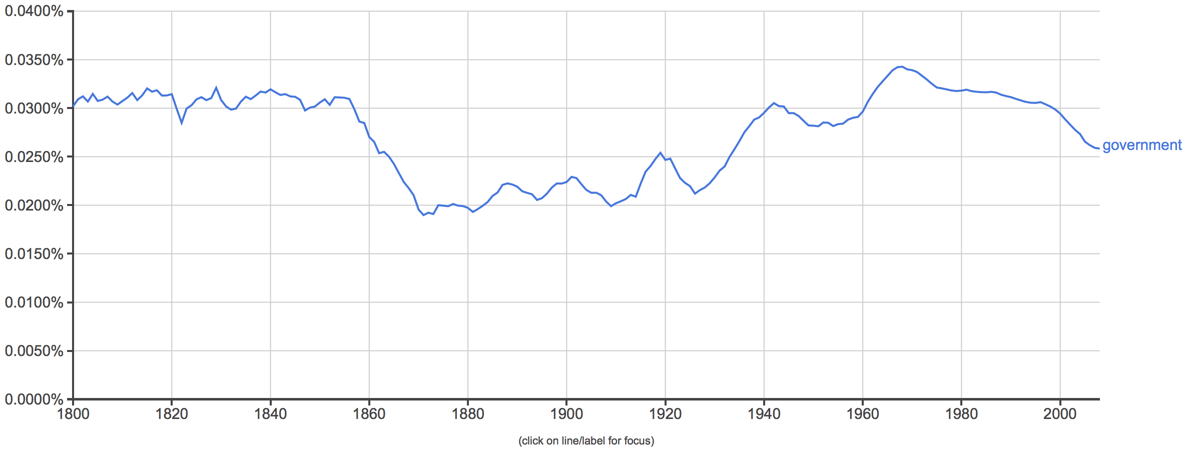 The graph show me that “government” has always been used very frequently for decades. The reason behind I think is because government is such an important element in people’s life. At the same time, the head of the governments are always rotating. The policies are always changing. Thus government is always a big topic.